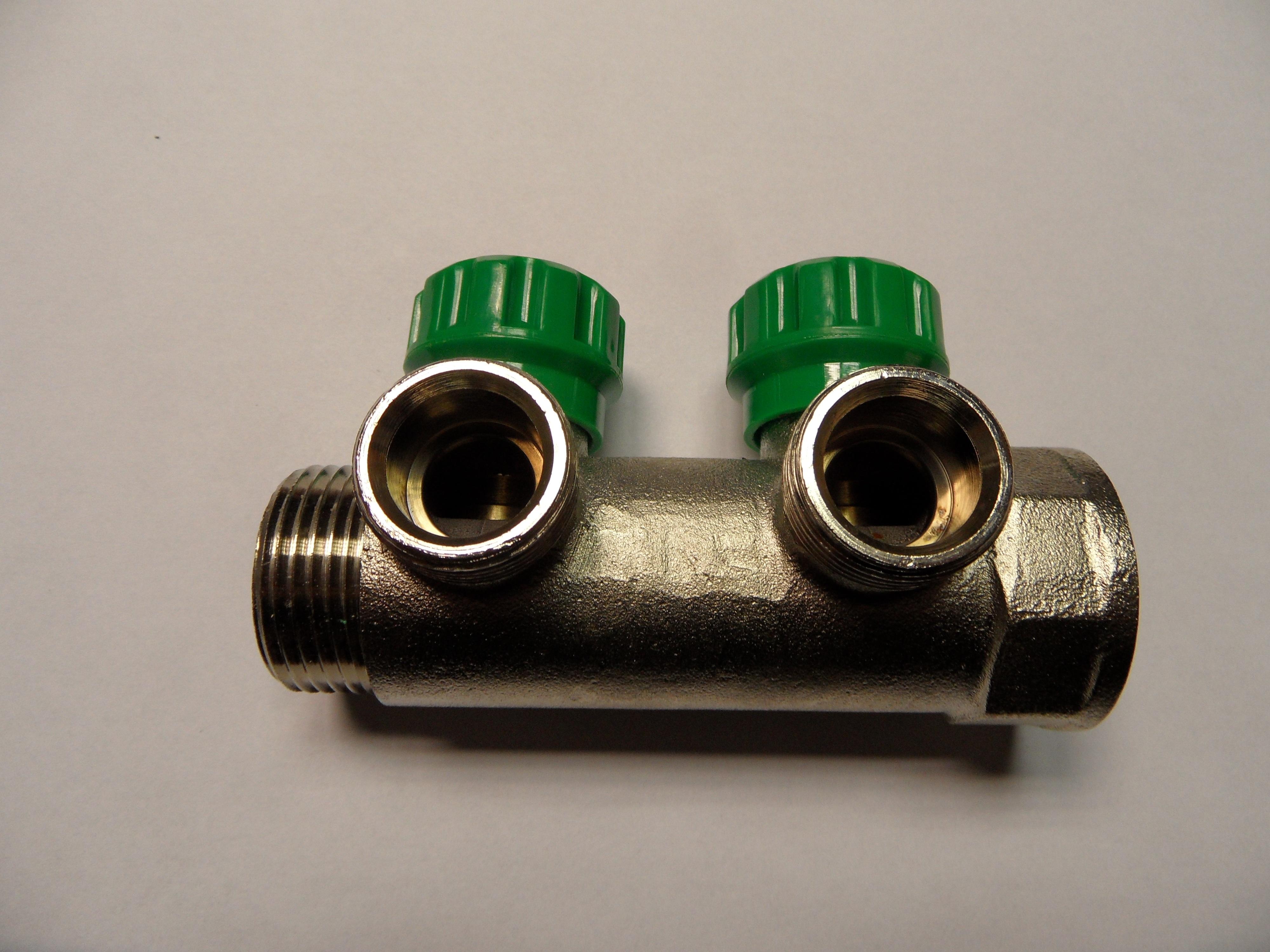 Fém alapanyagú, 1" osztótest elzárható szelepekkel. normál 3/4" csatlakozással.